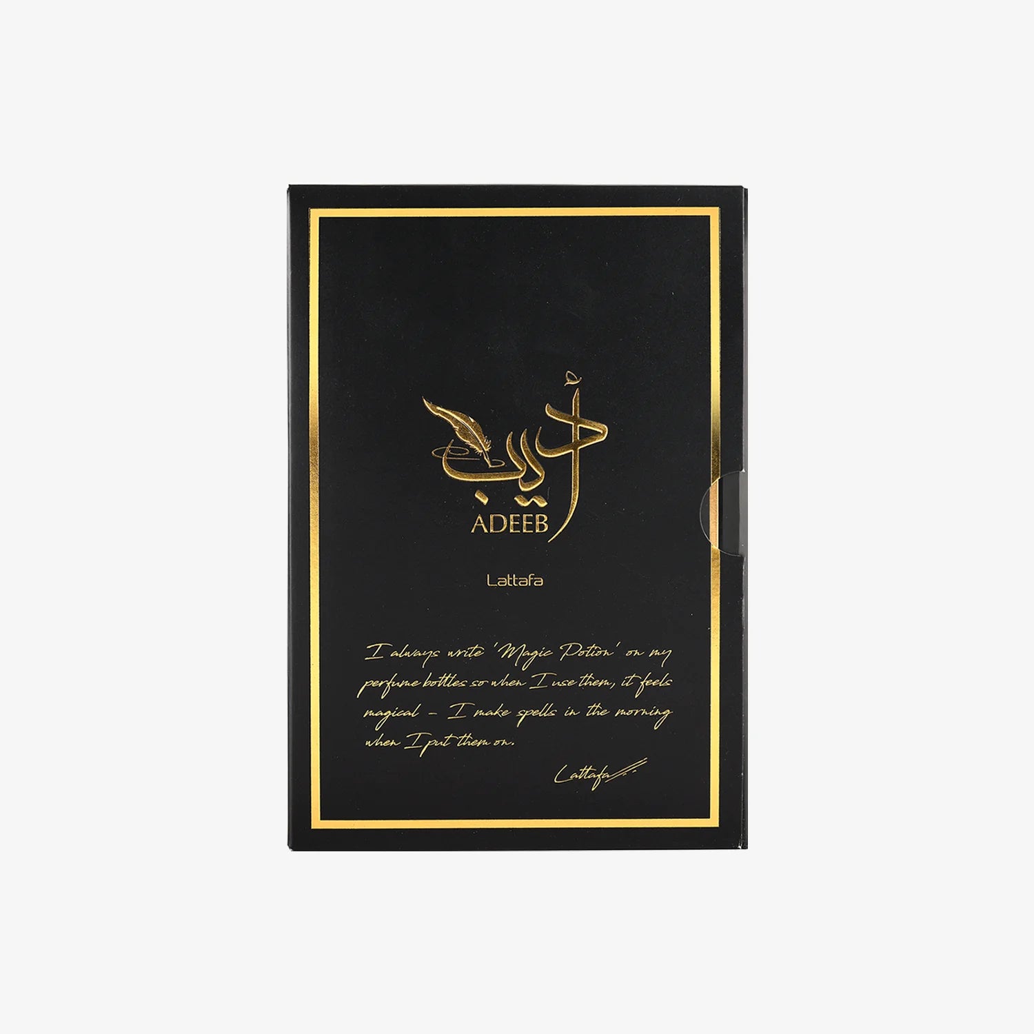 Adeeb by Lattafa Perfumes is a Woody fragrance for women and men. Adeeb was launched in 2020. Top notes are Tobacco, Cinnamon and Vanilla; middle notes are Spices, Thyme, Agarwood (Oud), Smoke, Herbal Notes and Cloves; base notes are Patchouli, Cedar, Sandalwood, Musk and Black Amber.