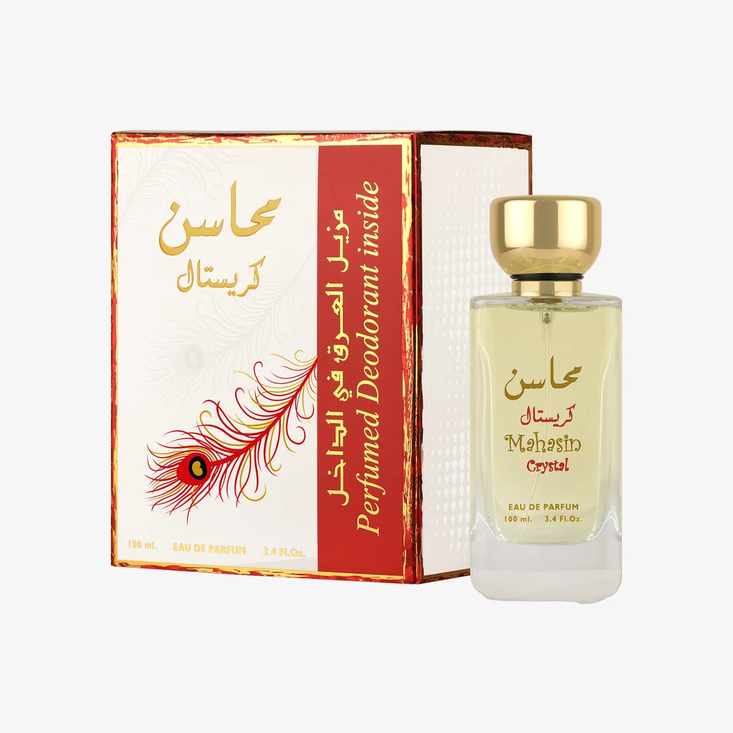 Mahasin Crystal by Lattafa Perfumes is a Floral Woody Musk fragrance for women. Top notes are Apple, Tangerine, Black Currant and Bergamot; middle notes are Freesia, Lily-of-the-Valley, Jasmine and Gardenia; base notes are Vanilla, Sandalwood, Musk and Amber. Set Contents: 3.4 oz Eau de Parfum Spray; 1.7 oz Deodorant Spray.